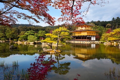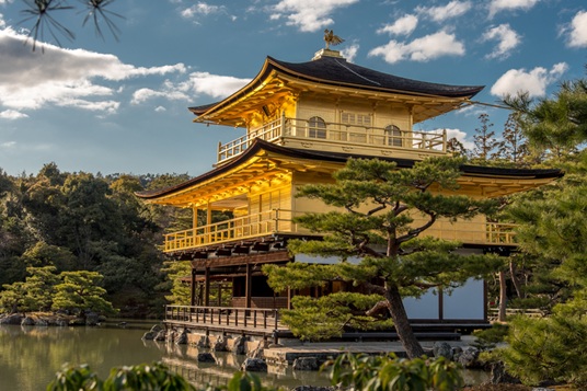 Le temple Rokuo-ji, ou pavillon en or en raison de son pavillon couvert d’une feuille d’or, se trouve au nord-ouest de Kyoto. Le temple fut bâti en 1397 et devint un temple zen après la mort du Shogun Ashikaga Yoshimitsu. Le temple de Rokuon-ji fait partie du patrimoine mondial de l’UNESCO depuis 1994.