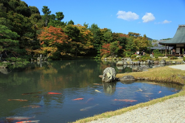 Au centre du jardin se trouve l’étang Sogenchi qui a été aménagé par le moine Muso Soseki lui-même. Sa forme rappelle celle du caractère chinois Kokoro qui signifie « cœur illuminé ». Le jardin possède une variété et une beauté florale hors du commun qui sont soulignées par les montagnes Arashiyama et Ogura se trouvant derrière. Il est même parsemé de cailloux représentant une île entourée de plage. Grâce à tous ces éléments, le jardin et sa forêt de bambous sont d’une incroyable beauté tout au long de l’année.